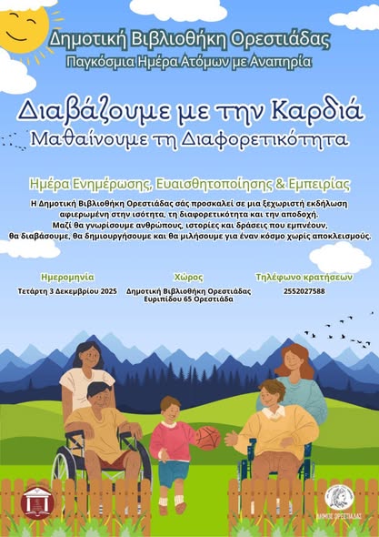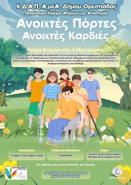 Ο Δήμος Ορεστιάδας, με αφορμή την Παγκόσμια Ημέρα Ατόμων με Αναπηρία, που τιμάται κάθε χρόνο στις 3 Δεκεμβρίου, προγραμματίζει μια σειρά δράσεων με στόχο την ευαισθητοποίηση, την ενημέρωση και την κοινωνική ένταξη των ατόμων με αναπηρία.