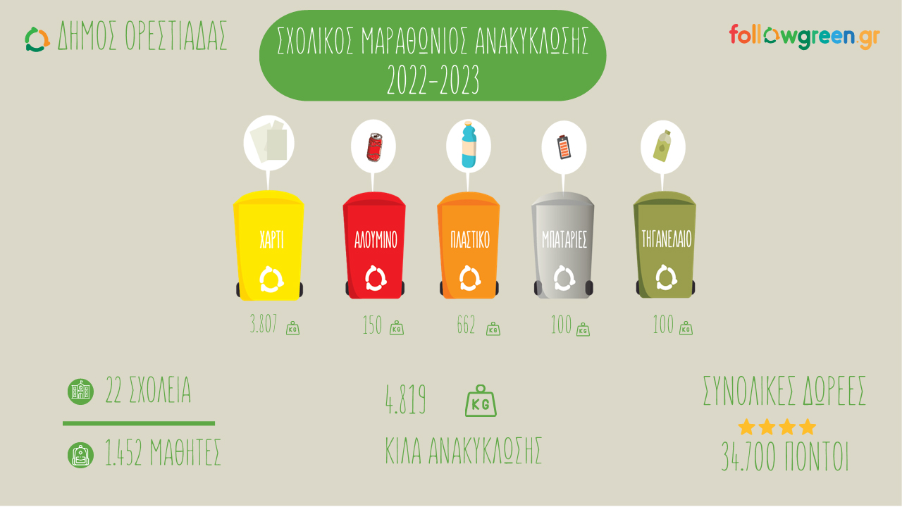 Την Παρασκευή 26 Μαΐου 2023 και ώρα 11:00 π.μ. πραγματοποιήθηκε με επιτυχία η εκδήλωση βράβευσης των σχολείων του Δήμου Ορεστιάδας στο Παλιό Κλειστό Γυμναστήριο Ορεστιάδας, για τη συμμετοχή τους στον Σχολικό Μαραθώνιο Ανακύκλωσης.